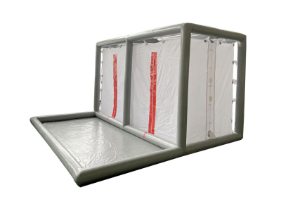 双人洗消帐篷用于消防人员洗消。操作简单、耐久性强、需气量小,自行竖立。外面充气框架,内挂防水布帘,下面气囊自然形成储水池,淋浴间全封闭化,防止污染液体扩散溢流,配备独立前置洗消池,作为预备洗消人员提前清洗消毒场地。采用双进双出,出入口,2间独立洗消空间,喷淋装置由10个高压喷嘴组成,供水管路与供水系统连接,配有电动充气泵,喷淋系统。有明显进出口箭头标识。独立进出口,防止二次污染。